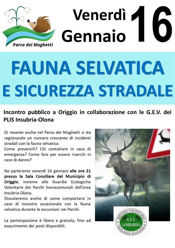 Ne parleremo venerd́ 16 gennaio alle ore 21.00 presso la Sala Consiliare del Municipio di Origgio. Le G.E.V. spiegheranno anche come comportarsi in caso di incontro occasionale con la fauna selvatica durante le escursioni nelle aree naturali.